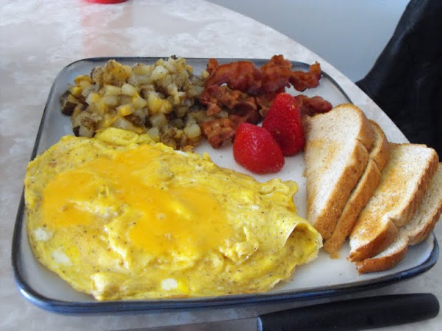 Whisk eggs in bowl, salt and pepper, pour in greased frying, flip, add cheese fold, add more cheese. Cut taters in small cubes, fry in pan, place in pan cover with cheese place in pre-heated oven. Fry bacon in pan until desired color, remove from pan. Take strawberries remove top, (fanning optional). Wha-la, happy girl (or boy) friend! Full belly, my job is done!